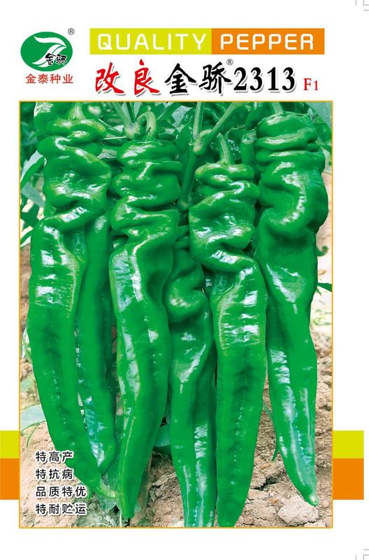 改良 2313 是早熟一代杂交种,株型健壮,叶片肥厚深绿色,茎杆粗壮节间短。果实长羊角形,基部皱纹,青果深绿色,红果鲜艳,辣味浓,膨果速度快,平均单果重50-60g左右,从开花到青果采收 20 天左右,连续挂果性较好,果长一般 25-30cm 左右,比金骄 2313长5cm 左右。
